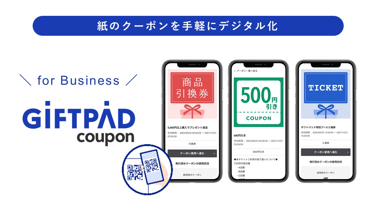 企業や自治体のDXを支援する株式会社ギフトパッド(本社:大阪府大阪市、代表取締役:園田 幸央、以下当社)は、法人向けデジタルクーポンサービス『Giftpad coupon』の提供を新たに2025年9月より開始しました。
