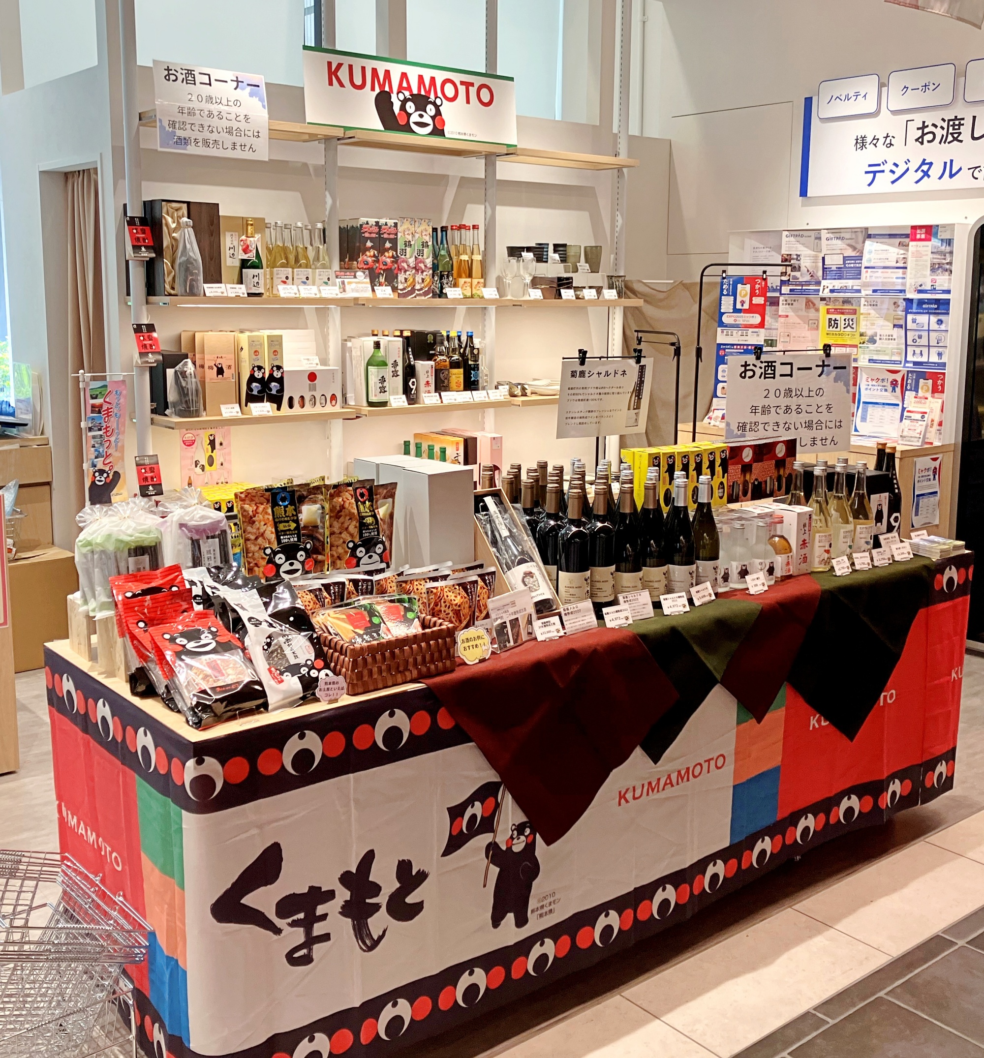 5月1日から1か月間出店し、熊本県産のお菓子や特産品、お酒など、約200種類のアイテムを販売させていただきました。店外の特設会場では、野菜や果物の即売会や、マスコットキャラクター「くまモン」の来場イベントも実施しました。